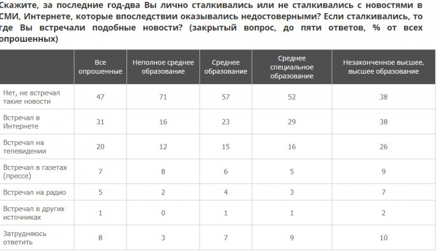 Среди тех, кто замечает недостоверность информации, которую предоставляют СМИ, уровень недоверия разница в зависимости от образования. 38% людей с неполным высшим и высшим образованием усмотрели фейковые новости, а среди обладателей среднего специального образования — 52%.