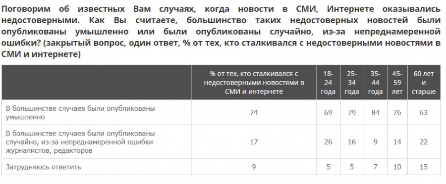 При этом 74% заявили о том, что их преднамеренно оправдывали. И лишь 17% предположили, что речь идет о случайных ошибках журналистов. Большинство из таких респондентов — молодые люди в возрасте от 18 до 24 лет.