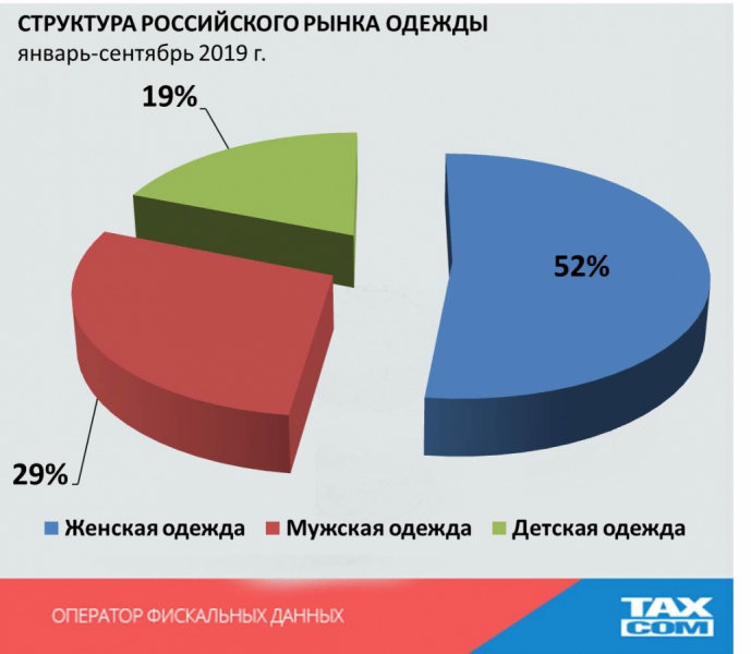 Женская одежда преобладает на рынке, на нее приходится 52% продаж. На втором месте — одежда для мужчин (29%) и на третьем — детская (19%).