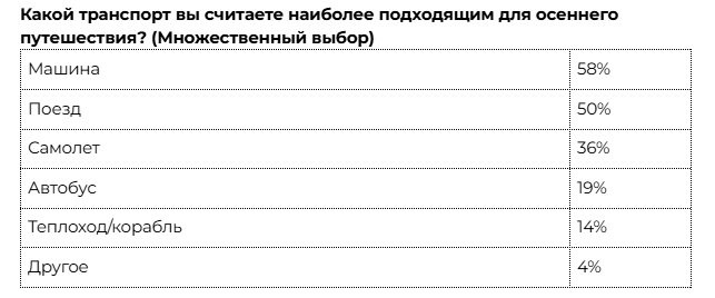 Октябрь для осенних путешествий выбирают 12% опрошенных, а ноябрь — всего 1%. При этом 10% участников опроса считают, что все осенние месяцы подходят для поездок, а 9% не считают ни один из них идеальным.