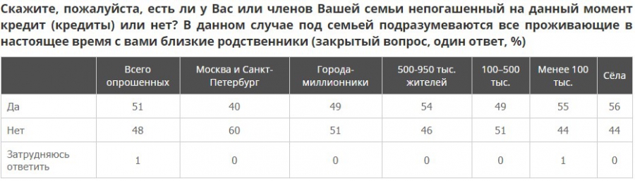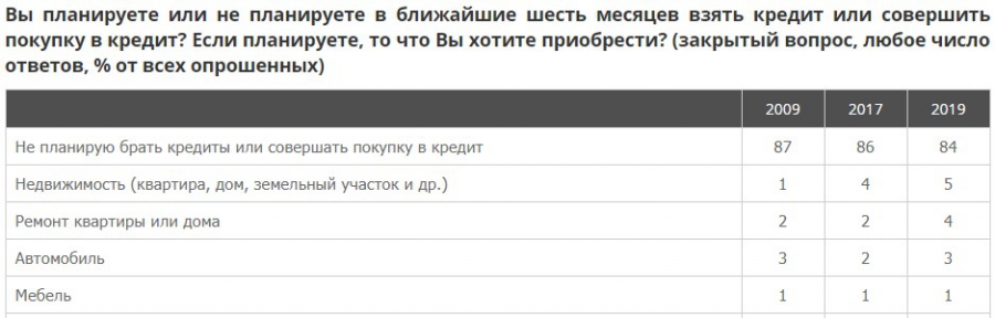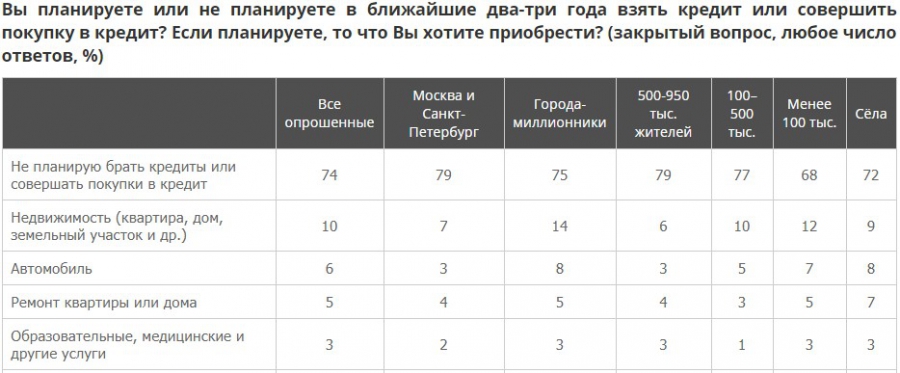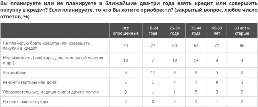 При этом 84% опрошенных не планируют в ближайшее время обращаться за кредитом, в ближайшие полгода. 74% россиян не хотят занимать деньги у банка и в ближайшие 2−3 года. В большинстве своем это люди старше 60 лет (86%), жители Москвы и Петербурга (79%) и жители городов с населением от 500 до 950 тысяч (79%).