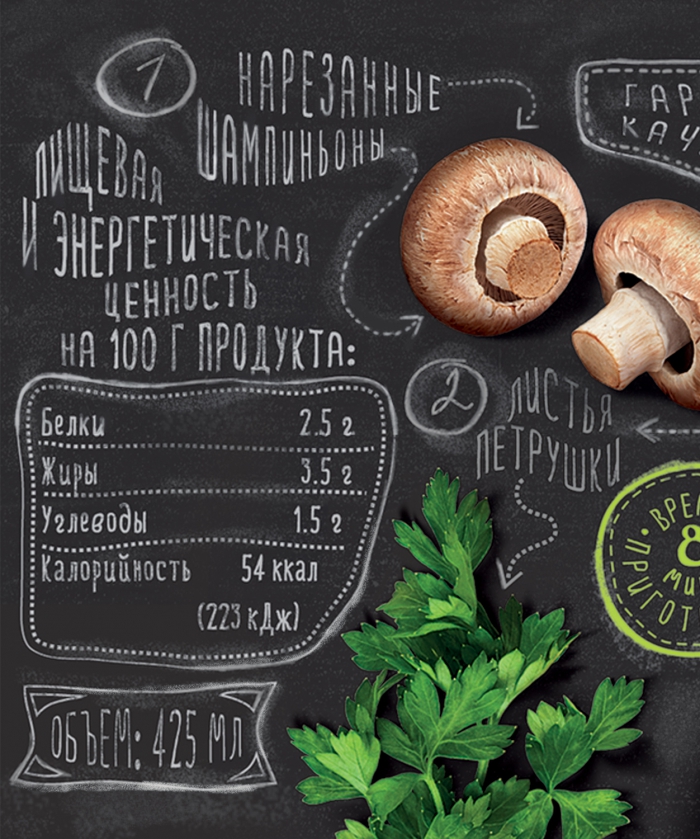 Изображение готового блюда в сковородке соседствует на упаковке с входящими в его состав ингредиентами, лаконично выложенными на кухонном столе, и логотипом Bonduelle «на тарелочке». Заголовки и другие тексты, выведенные разноцветными мелками, ассоциируются с меню уютного кафе. «Это своеобразная подсказка покупательнице, намекающая, что создать атмосферу кафе у себя дома - легко: Bonduelle позаботилась обо всех приготовлениях», - комментирует арт-директор Depot WPF Мария Пономарева.