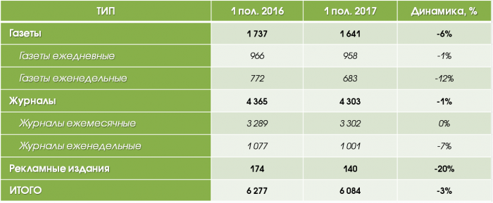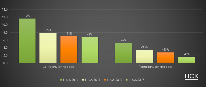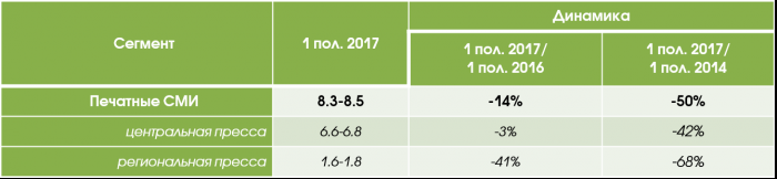 По данным АКАР, объем рекламных бюджетов в российской печатной прессе (суммарно по центральному и региональному сегментам) продолжает снижаться. В 1 полугодии 2017 года совокупные бюджеты печатных СМИ составили 8.4 млрд. руб., что на 14% меньше, чем в аналогичном периоде прошлого года.