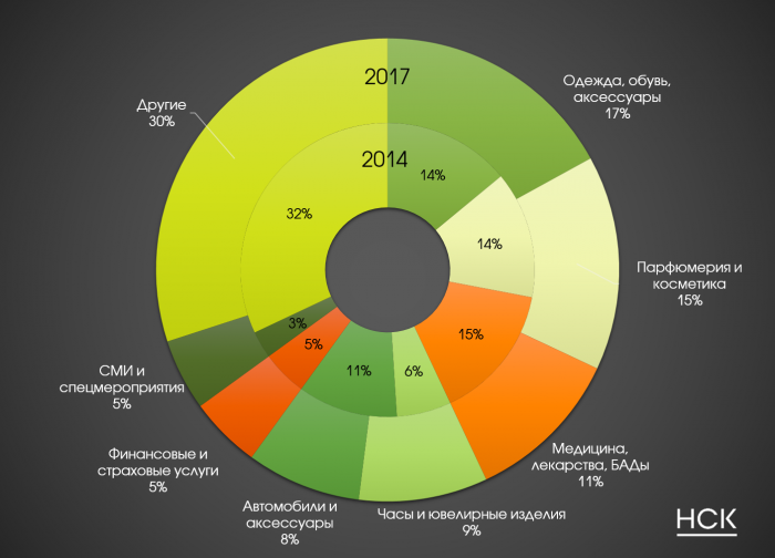 Последний кризис заметно повлиял на товарную структуру рекламы в центральной прессе. В 1 полугодии 2014 года на первом месте по объему рекламных расходов были представители категории «Медицина, лекарства, БАДы» (доля 15%), сейчас эта категория сместилась на третье место (доля 11%). Лидером в 1 полугодии 2017 года является категория «Одежда, обувь, аксессуары» (доля 17%), на втором месте – «Парфюмерия и косметика» (доля 15%).