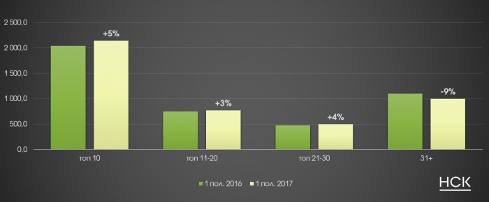 Суммарные бюджеты двадцатки крупнейших рекламодателей центральной прессы в 1 полугодии 2017 года выросли на 1%. Одновременно с этим рекламодатели, находящиеся за пределами первой сотни по объему рекламных расходов, сократили свои бюджеты в среднем на 6%. При этом общим трендом для рекламодателей является перераспределение бюджетов в пользу более крупных изданий на рынке.
