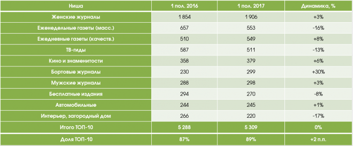 В список тематических ниш, для которых было характерно глубокое падение, в 1 полугодии 2017 года попали молодежные журналы (-49%), журналы о туризме и путешествиях (-49%), спортивные (-42%) и компьютерные издания (-41%). Все издания, ранее входившие в нишу «Путеводители по развлечениям» (например, «Афиша», «Time Out Москва» и др.), к началу 2017 года перестали выходить в печатном виде (но сохранили при этом свои интернет-версии).