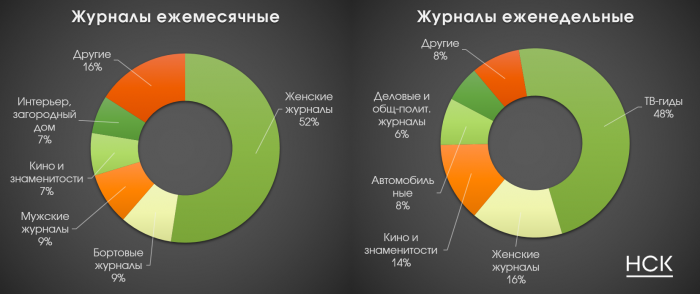Крупнейшей тематической нишей центральной прессы являются «Женские журналы» (доля в 1 полугодии 2017 года составила 32%). Крупнейшей товарной категорией – «Одежда, обувь, аксессуары», приносящая 17% рекламных доходов всему рынку центральной прессы и 26% доходов женским журналам.