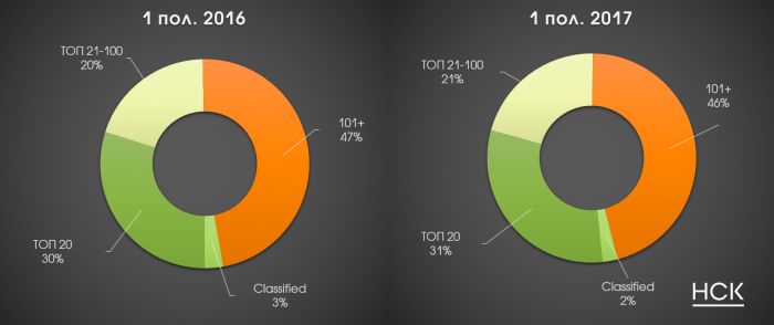 Рекламодатели в центральной прессе. В 1 полугодии 2017 года произошло небольшое перераспределение долей между группами рекламодателей в общем объеме рекламы в центральной прессе. Совокупная доля ТОП-20 увеличилась с 30% в январе-июне 2016 года до 31% в рассматриваемом периоде. В этой группе суммарные бюджеты выросли в денежном выражении по сравнению с 1 полугодием 2016 года на 1%. Доля группы «ТОП 21-100» возросла на 1 п.п. (до 21%), динамика бюджетов составила +3%. Доля группы «Classified» сократилась с 3% до 2% из-за существенного падения бюджетов (-21%). Доля группы «101+» составила 46% (меньше на 1 п.п., чем в прошлом году), рекламодатели данной группы уменьшили рекламные траты на 6%.