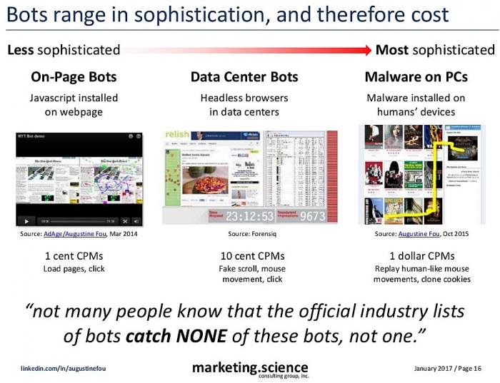 Боты бывают как простые (Javasript, с помощью которого загружаются веб-страницы и генерируются клики), так и продвинутые (вредоносные программы, которые заражают компьютеры простых пользователей и имитируют поведение реальных людей). Миллионы ботов посещают сайты и создают поисковую историю, благодаря чему они выглядят привлекательной аудиторией в глазах рекламодателей. Затем боты заходят на фейковые сайты, тем самым подавая сигнал рекламным сетям размещаться на этих площадках.