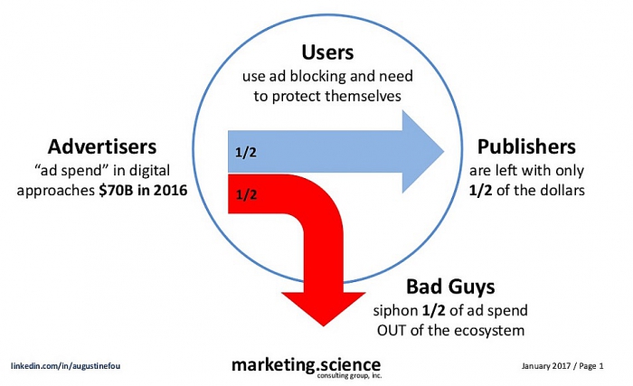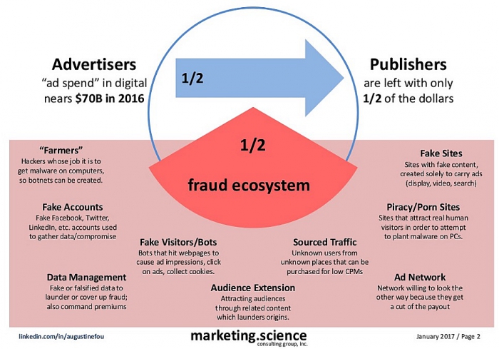 В начале января его компания подготовила презентацию, из которой следовало, что в 2016 году почти половина рекламных расходов на интернет-рекламу в США досталась нечестным игрокам. В прошлом году фрод забрал 31 млрд долларов из потраченных 70 млрд, в 2015-м — 24 млрд из 60 млрд.