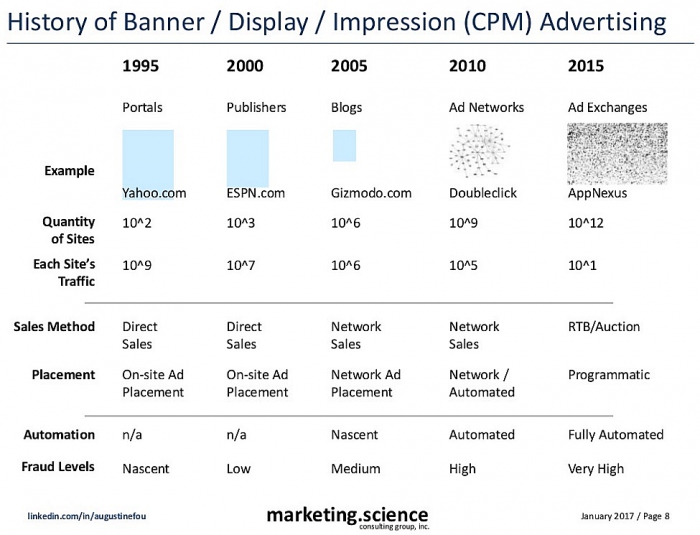 По словам Фу, мошенники создают фейковые сайты и тысячами добавляют их в рекламные сети. В целом цифровая экосистема представляет собой карточный домик, выстроенный на фальшивых метриках. Рекламные сети быстро превращаются в рассадник ботов. О масштабах можно судить, например, по сервису AppNexus: в 2015 году он зачистил систему от фрода, в результате число показов в США упало с 260 до 20 млрд, а показатель CRM подскочил сразу на 800%.