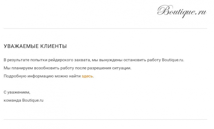 Интернет-магазин Boutique.ru сообщил о попытке рейдерского захвата. «Рейдеры парализовали работу компании, и мы больше не можем предоставлять должный уровень обслуживания и ассортимента», — заявил глава компании Денис Белов.