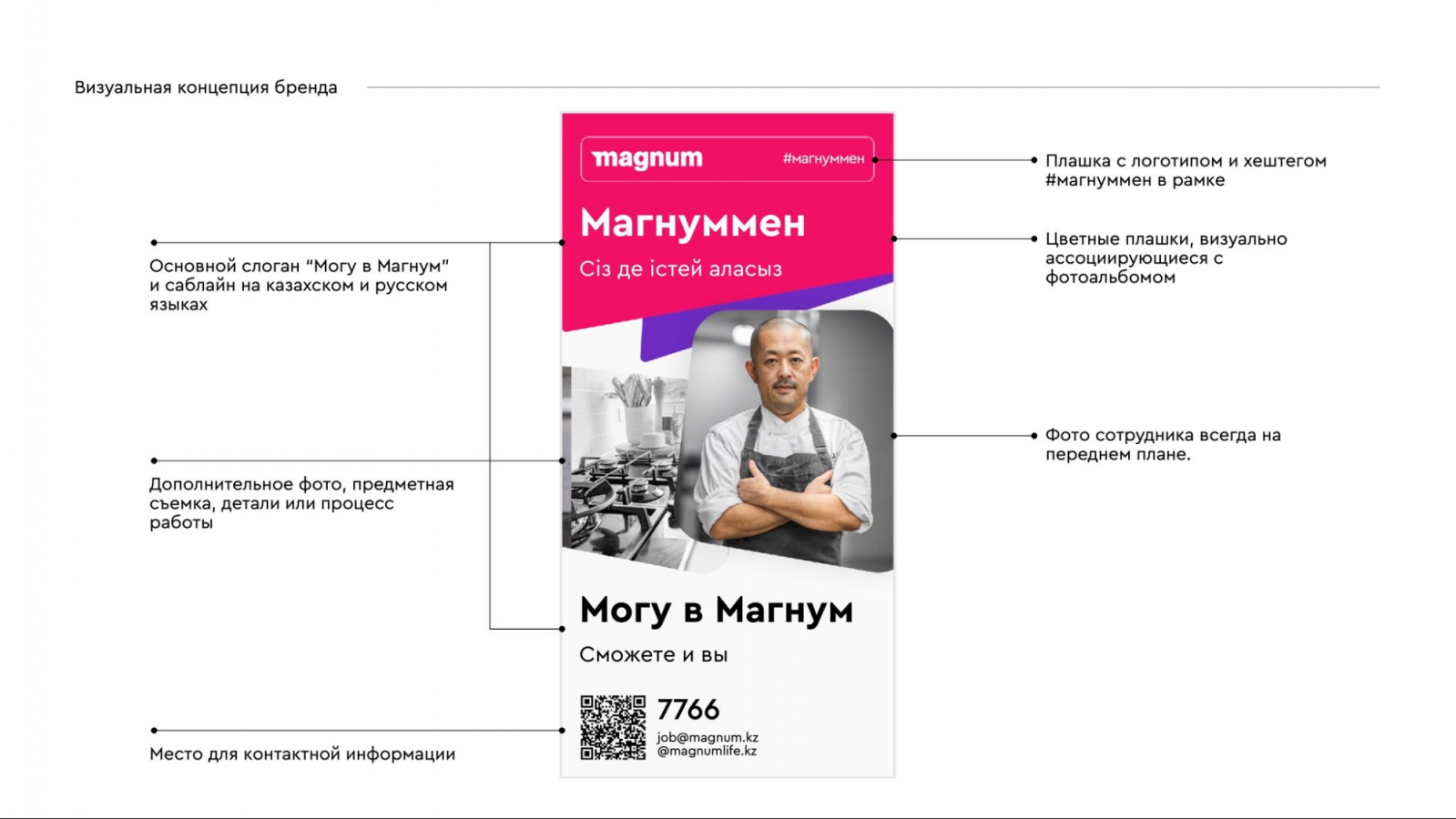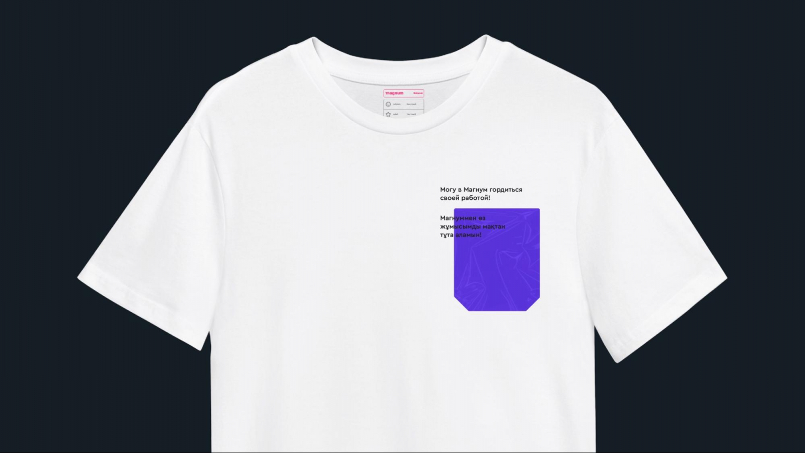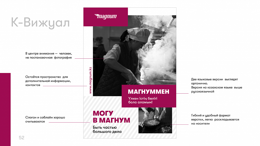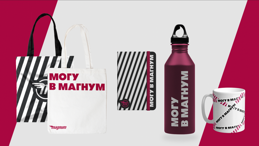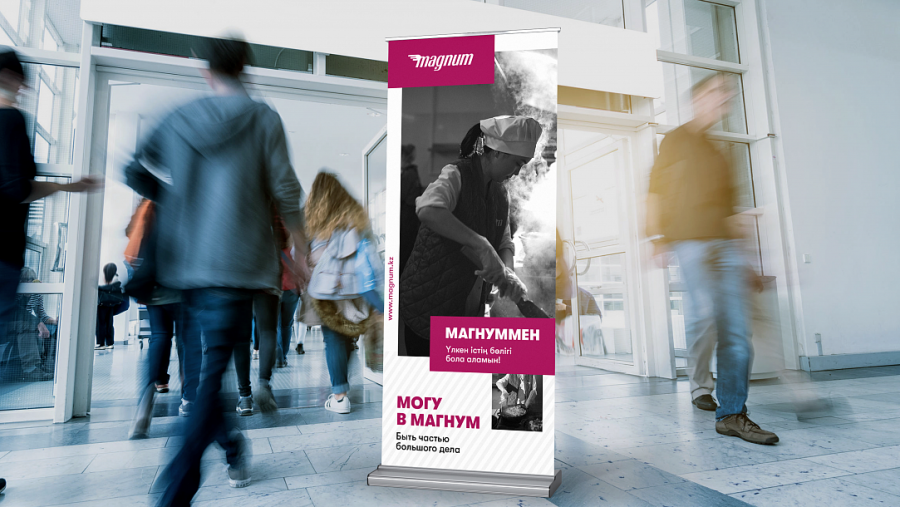 Идея гордости обозначилась и в слогане: новое позиционирование ритейлера — «Могу в Магнум». Это не только игра на созвучии слов, но и возможность каждого сотрудника выразить своё отношение к работе в торговой сети. Для усиления смыслов агентство также предложило использовать дополнительные саблайны, которые могли бы продолжить главное сообщение. Например: