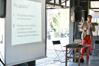 Открыли Brand Corner Елена Юферева и Григорий Храбров из Brandson. Их интерактивное выступление было посвящено игровой составляющей бренд-стратегий. Сегодняшние потребители товаров и услуг ставят знак равенства между потреблением и спектаклем, и мотивировать их к покупке становится все труднее. Формула, предложенная Еленой и Григорием: не просто предложить качественную упаковку для качественного товара, но и сформировать виртуальную реальность, в котором этот товар обретет дополнительную ценность.