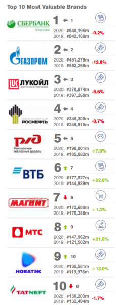 В пятерку лидеров также вошли «Газпром», «ЛУКОЙЛ», «Роснефть» и РЖД. При этом «Магнит» спустился на 7 место, уступив место ВТБ. 11 место сохраняет ритейлер «Пятерочка». поисковая система «Яндекс» увеличила стоимость на 31% и поднялась на 1 пункт, заняв 12 строчку.