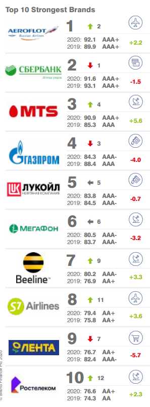 «Аэрофлот» стал победителем в двух номинациях: самый сильный бренд России среди отечественных корпораций и самый сильный авиационный бренд в мире. Индекс силы бренда составил 92,1 балла из ста возможных. Сравнительная сила бренда учитывает инвестиции в маркетинг и рекламу, акционерный капитал и результаты работы. Высший рейтинг AAA+ в этой категории имеют только три российские компании: «Аэрофлот», Сбербанк и МТС.