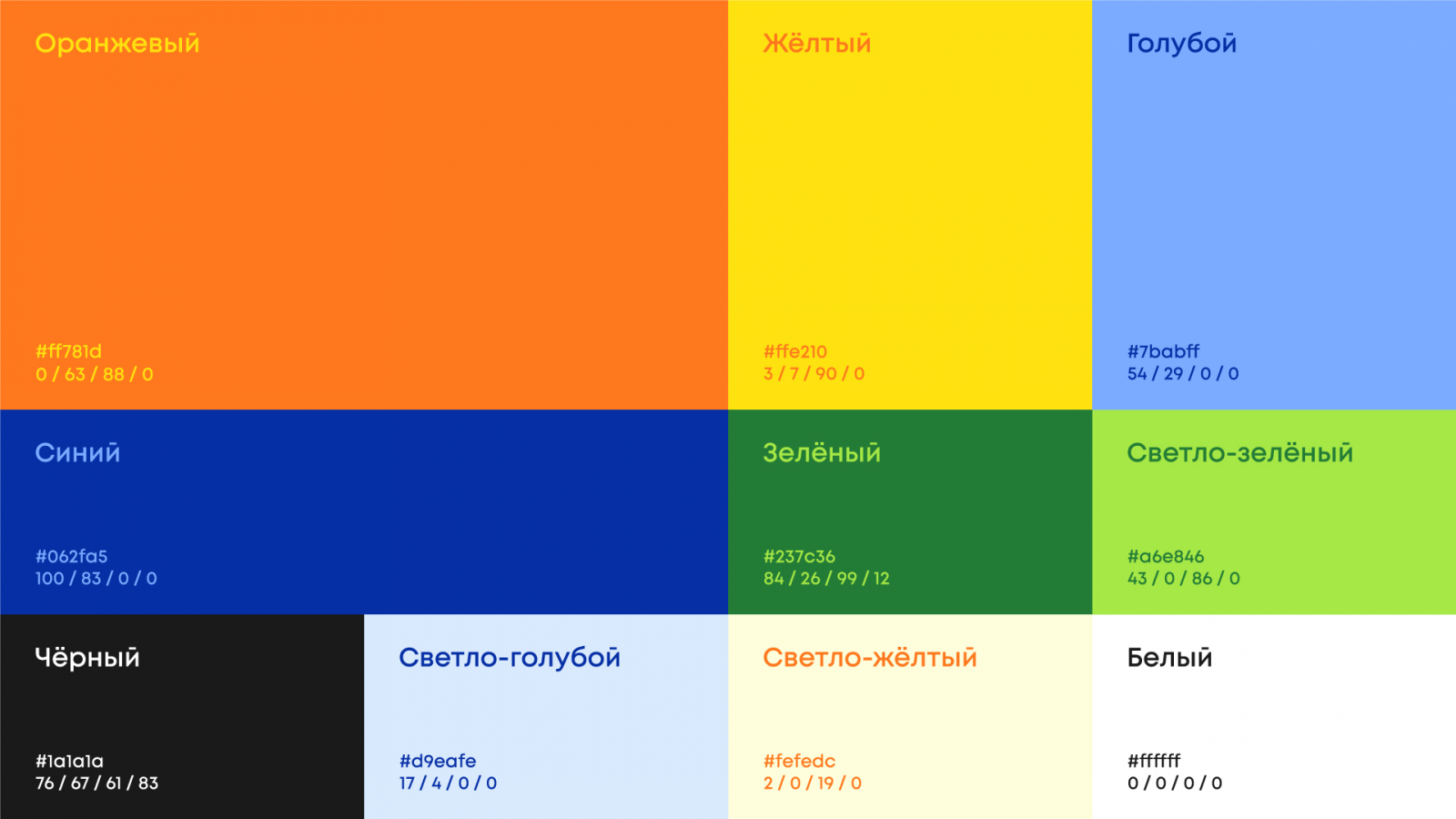 При создании цветовой гаммы команда Brand Hub сфокусировалась на богатой палитре, которая выражает разносторонность участников фестиваля и задает позитивный, дружеский настрой. С помощью яркости дизайнеры донесли идею жизнерадостности, оптимизма и детства. Цвета, которые помогают в передаче таких эмоций — желтый, оранжевый, зеленый, голубой.