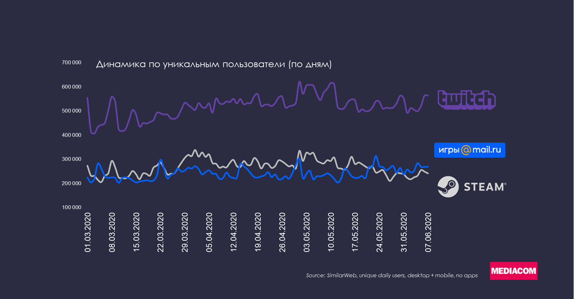 На текущий момент самый большой драйвер роста — это мобильный гейминг, включая широкий сегмент казуальных игр. Тем не менее за последние полгода рост наблюдался везде: рекорды по количеству пользователей онлайн ставил Steam, внушительные цифры по увеличению активности показал Discord, на 30%-40% увеличилась активность на Twitch. Причем рост продолжается даже после отмены режима самоизоляции.