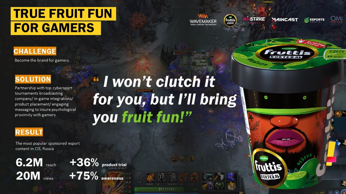 - Бренд может выступить спонсором трансляции турнира по охватной игровой франшизе и доносить свою коммуникацию до аудитории за счет спонсорских активаций. Например, Campina Fruttis на стримах турниров по Dota 2 заняли место на экране и показывали свое сообщение: «Я не затащу за тебя катку, но подарю отличное настроение».