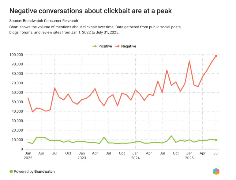 Дополнительный негатив вызывает и сама рекламная среда: 54% разговоров о рекламе выражают раздражение, а кликбейт у 90% вызывает исключительно негатив. Контент, который считается навязчивым, провоцирует на 70% больше негативных реакций. И наоборот, реклама, воспринимаемая как полезная или честная, вызывает на 41% больше положительных реакций.