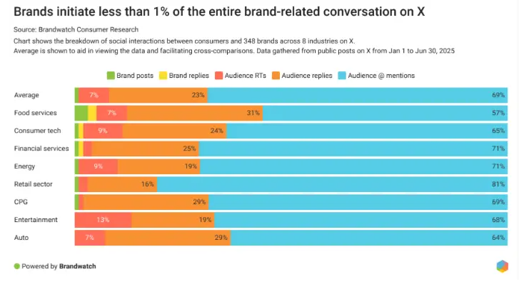 Бренды практически не участвуют в разговорах о себе. Так, менее 1% бренд-ориентированных дискуссий в X инициируются самими компаниями, и они редко вмешиваются в остальные 99% обсуждений. Это привело к тому, что призывы к бойкоту брендов выросли на 95% в первом полугодии 2025 года, а упоминания фразы «не покупайте» появились в 836 тыс. из 900 млн проанализированных публикаций.
