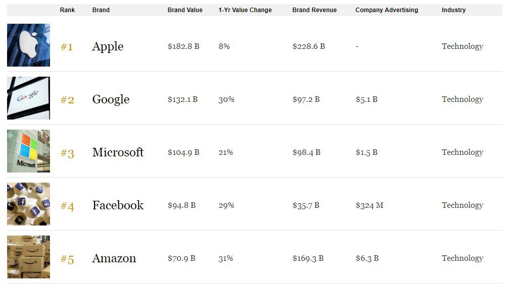 Apple (гаджеты), Google (поиск), Microsoft (софт), Facebook (соцсети) и Amazon (ритейл) прочно захватили топ рейтинга самых дорогих брендов по версии Forbes. Технологические компании удерживают лидерство на протяжении последних лет, выстраивая сильные бренды и предлагая потребителям отличную продукцию и услуги.