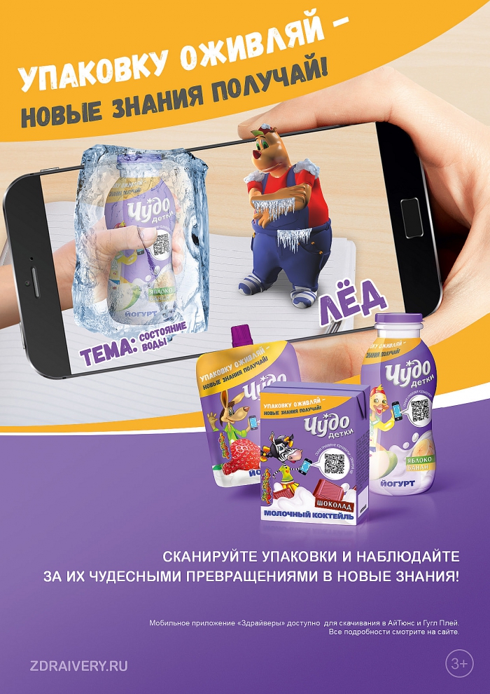 Бренд молочной продукции «Чудо Детки» и команда агентства Progression запустили мобильное приложение в формате дополненной реальности. На упаковке продукции бренда, отмеченной оранжевой лентой, а также на некоторых учебниках начальной школы, есть специальный код. Ребенок наводит камеру, код срабатывает и «Здрайверы» начинают рассказывать увлекательные истории из мира науки.