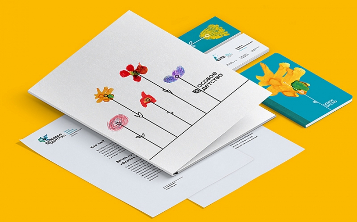 В основу айдентики бренда легли рисунки детей – маленьких посетителей Лечебного Центра. Из нарисованных цветов был сформирован большой банк иллюстраций. Так стиль «Особого Детства» может быть собран из разнообразных картинок и легко адаптируется к разным носителям, мероприятиям и структурам Центра.