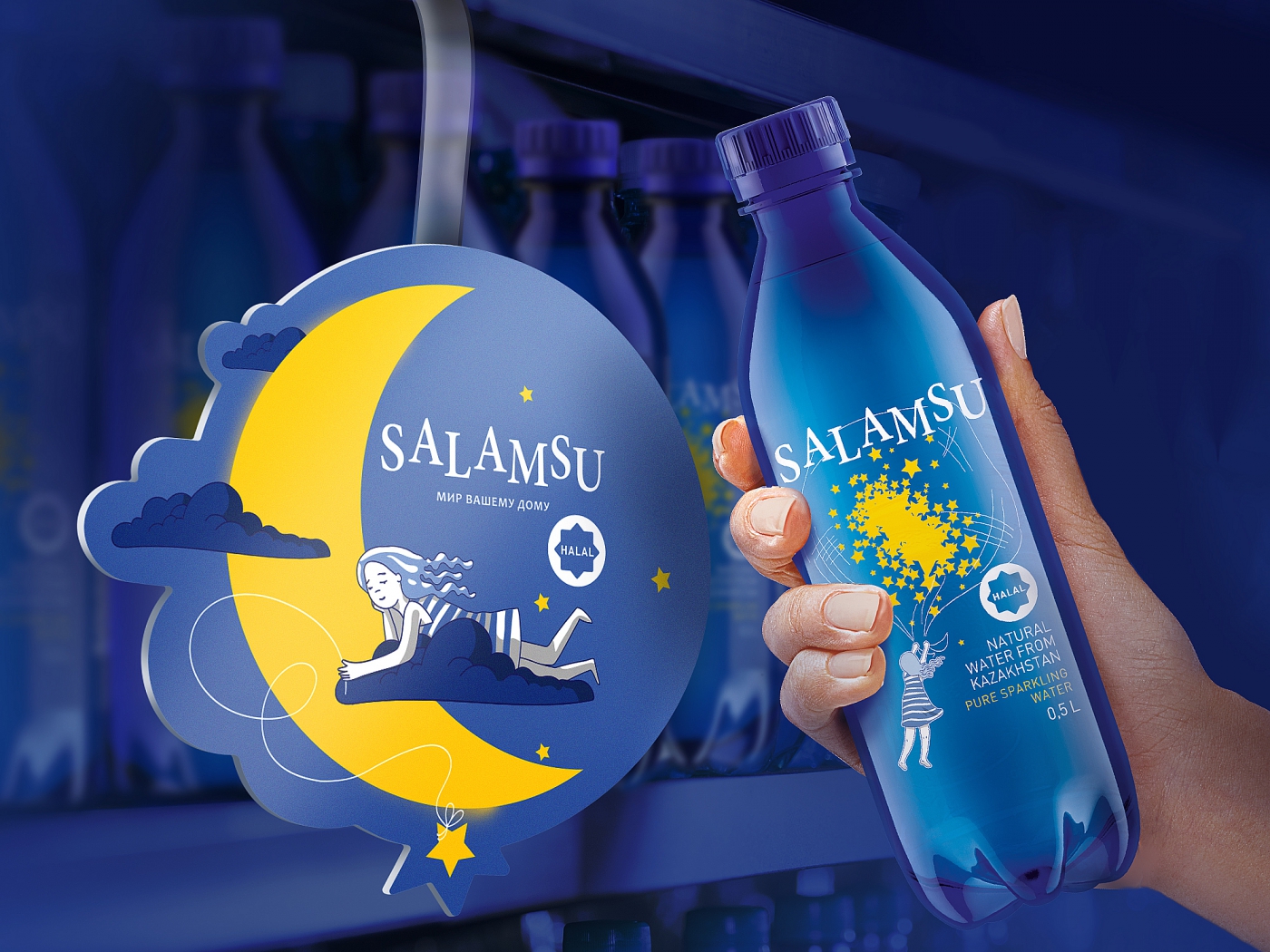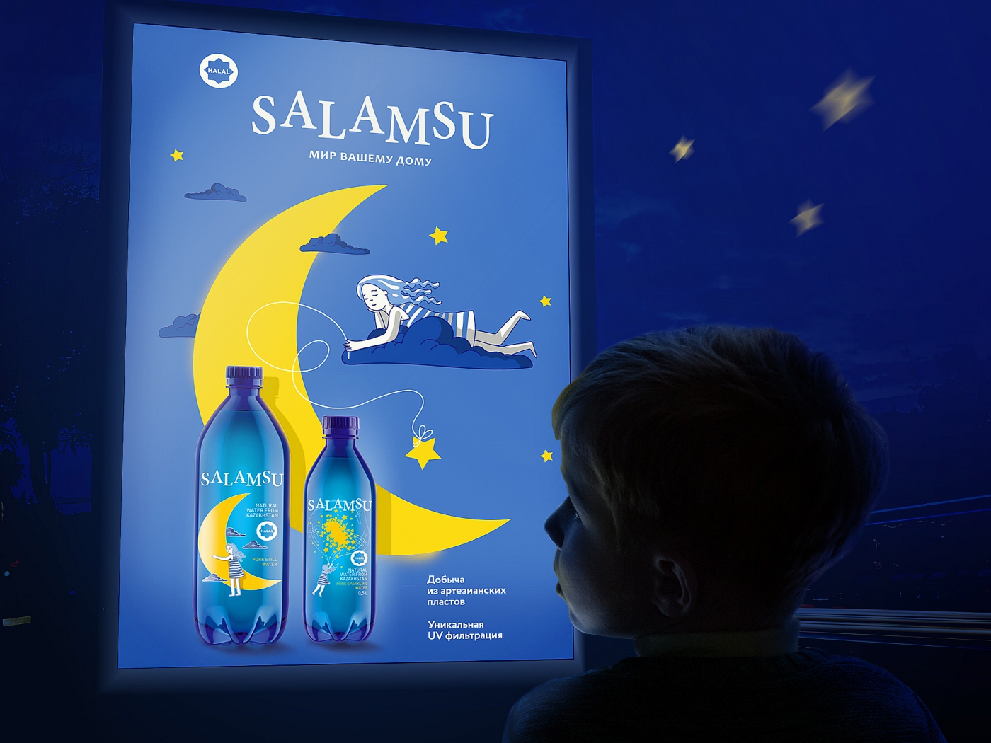 Перед агентством стояла задача разработать новый бренд воды SALAMSU (имя было предоставлено заказчиком). Дизайнеры решили построить концепцию бренда на сказках и рассказать историю о маленькой девочке, вокруг которой простирается волшебный мир звезд. Героиня кутается в облака как в теплый плед, ловит звезды и кометы. Ночь — это время мечтаний и грез, уверены авторы проекта.