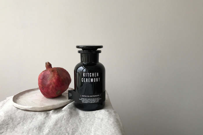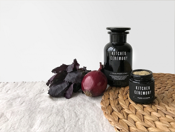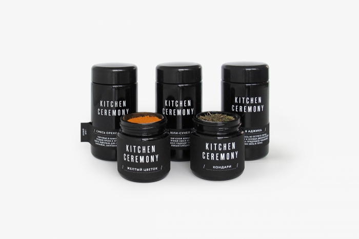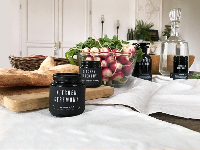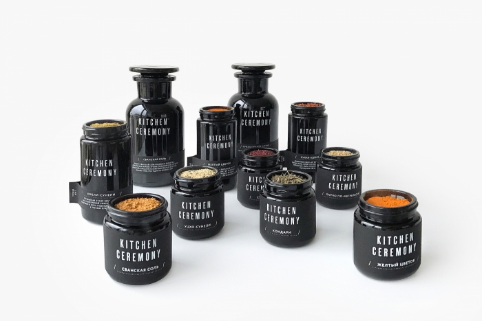 Перед Ольгой и Наталией стояла задача разработать не только красивую, но и практичную упаковку – чтобы вкус пряностей оставался таким же, как сразу после помола. Поэтому все пряности продаются в швейцарских флаконах из темно-фиолетового стекла. Чтобы подчеркнуть ориентацию бренда на премиальный сегмент, девушки выбрали зауженные шрифты, лаконичный стиль и уделили особое внимание деталям. Пряности Kitchen Ceremony продаются через сайт и вскоре появятся в магазине органических продуктов «Амбар».