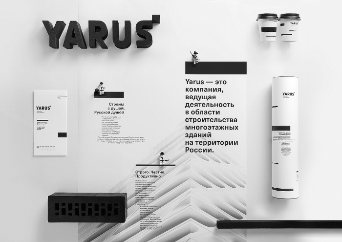 Перед специалистами стояла задача показать «русское» происхождение Yarus. Кроме того, в дизайне должна угадываться деятельность компании – строительство многоярусных зданий. В соответствии с этой целью и было выбрано название бренда – «Yarus».