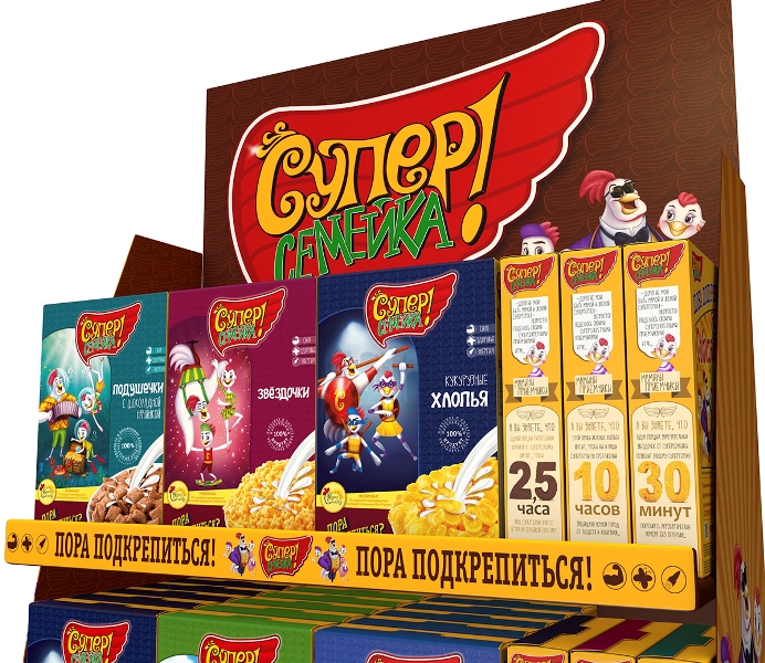 Продукция линейки сухих завтраков «Суперсемейка» ориентирована на семью и, в первую очередь, на детей дошкольного и школьного возраста. Именно поэтому для каждого продукта (на данный момент их пять) дизайнеры разработали историю из «будней супергероев».