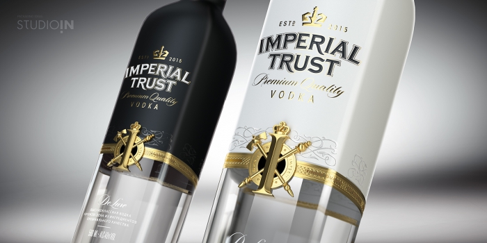 С названием бренда перекликаются разные элементы упаковки: имперские символы, корона, золотой кант и римская цифра I. По словам авторов проекта, так выглядят атрибуты высокого статуса. Название водки – IMPERIAL TRUST также должно говорить об амбициях и силе бренда.