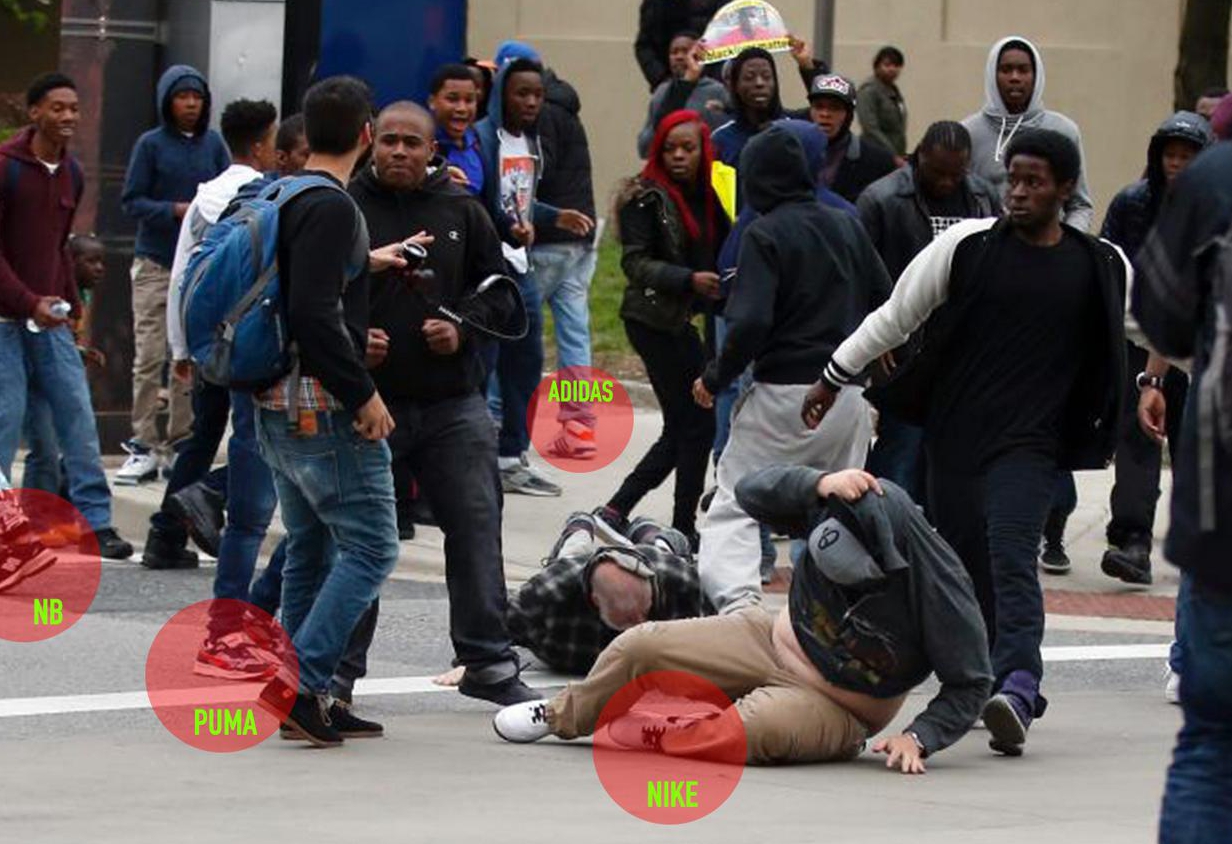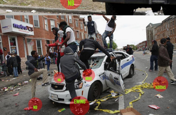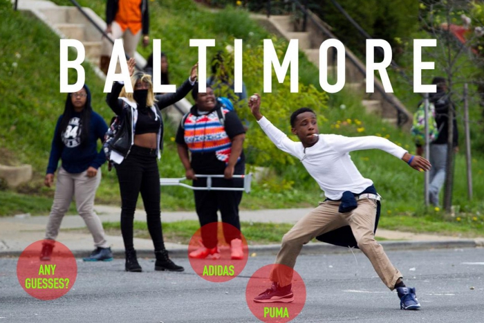 Проект под названием #brandedriots (дословно - «брендированные беспорядки») был запущен сегодня утром. Он представляет собой набор фотографий с мест погромов в Балтиморе, на которых авторы проекта кропотливо отметили бренды обуви участников беспорядков. Начать рекламисты решили именно с обуви, поскольку, видимо, ее легче всего было идентифицировать.