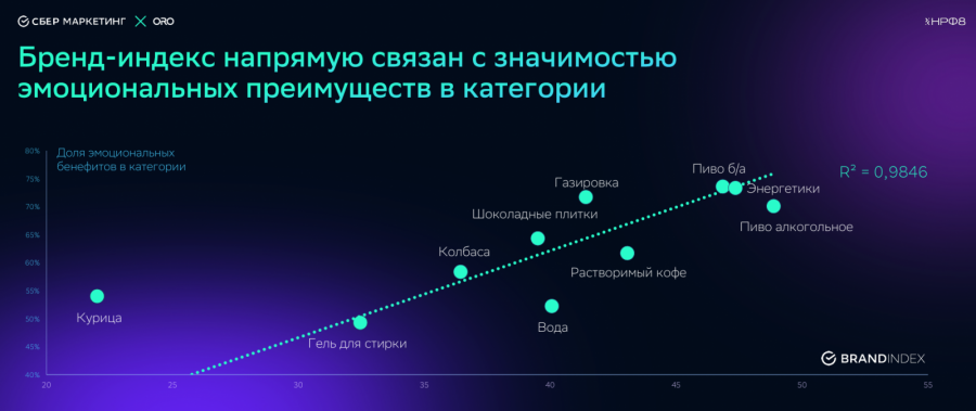 Бренд-индекс товаров распределился следующим образом: курица (22), стиральный гель (32), колбаса (36), шоколадные плитки (40), вода (40), газировка (41), растворимый кофе (43), безалкогольное пиво (47), энергетики (47), алкогольное пиво (49). С ростом показателя бренд-индекса происходит перемещение по шкале вверх от категорий, которые плохо развиты с точки зрения брендинга товаров, к более развитым.