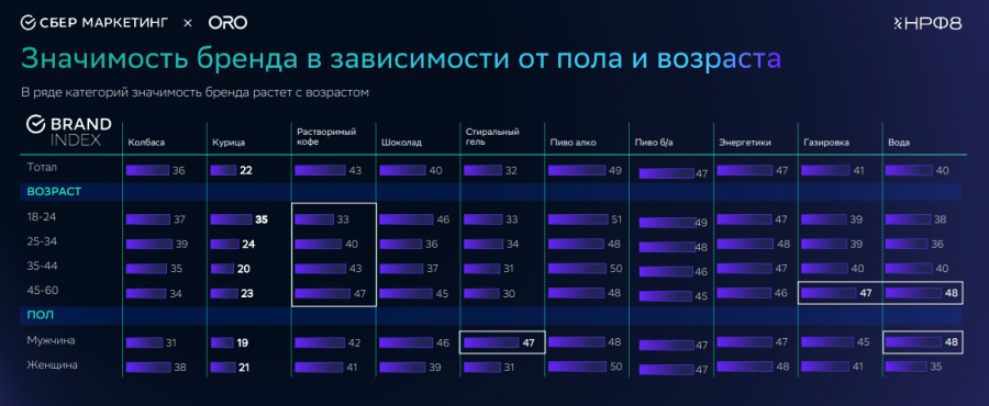 Аналитики выяснили, что пол и возраст респондентов имеют существенное значение при определении бренд-индекса товаров. Например, в категории растворимого кофе есть прямая зависимость между возрастом и значимостью бренда: чем старше покупатели, тем большее для них значение имеет бренд растворимого кофе. Также было обнаружено, что старшее поколение респондентов значительно чаще ориентируется на бренд газировки и воды, чем миллениалы и зумеры, а бренд геля для стирки имеет существенно большее значение для мужчин, чем для женщин.