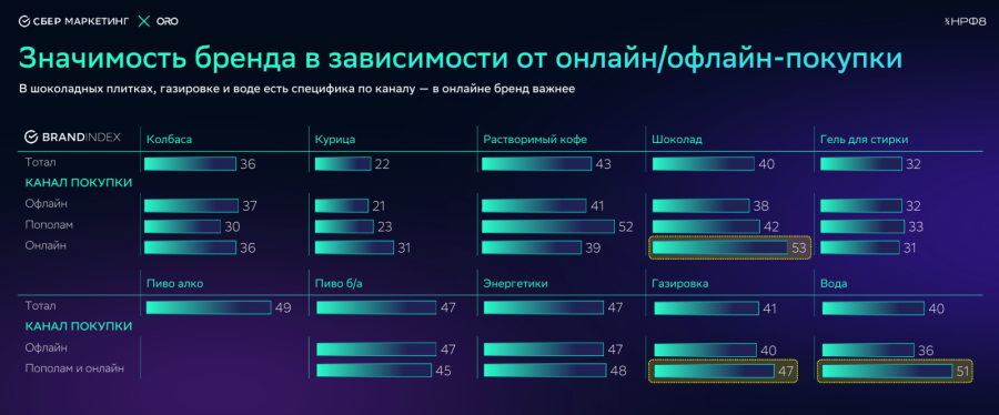 Площадка, на которой респонденты приобретали товары, также определяет значение бренд-индекса товаров. Например, покупатели шоколадных плиток, газировки и воды придают более важное значение бренду, если совершают покупку онлайн. Это связано с тем, что многие покупатели целенаправленно ищут конкретные бренды при покупке онлайн в этих категориях.
