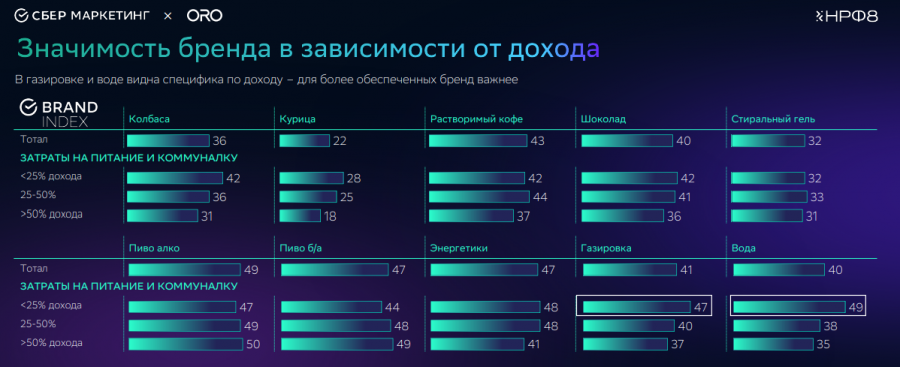 Исследование также установило, что доход респондентов имеет важное значение при определении ценности бренда. Например, если в категории газировки и воды средний бренд-индекс составляет 41 и 40, то для группы людей, чьи затраты на питание и коммуналку составляют менее 25% от общих расходов, бренд-индекс уже 47 и 49 соответственно.