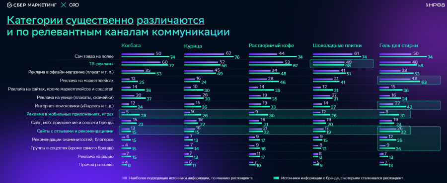 В ходе исследования также было установлено, что каналы продвижения разных товаров существенно отличаются. Респондентов спросили, откуда они узнают о товарах и какие каналы они считают наиболее релевантными. Лидерами в обоих случаях стали ТВ-реклама и наличие товара на полке магазина, при этом в категории гелей для стирки самым популярным ответом стали онлайн-площадки.
