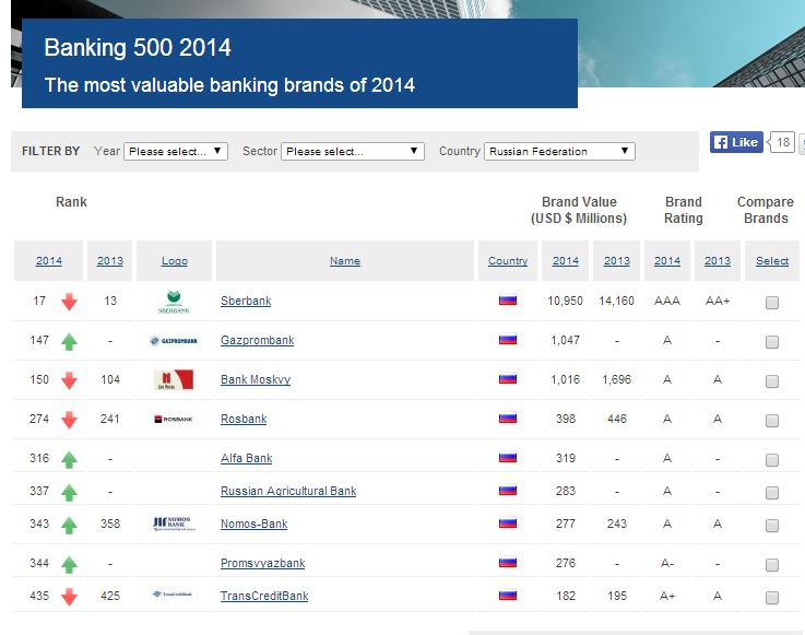 Новичками в Banking 500 стал российские Газпромбанк – он находится на 147 месте с брендом стоимостью 1,047 млрд долларов. Кроме того, в свежий рейтинг попали Альфа-Банк (316 место, 319 млн), Россельхозбанк (337 место, 283 млн), Промсвязьбанк (344 место, 276 млн).