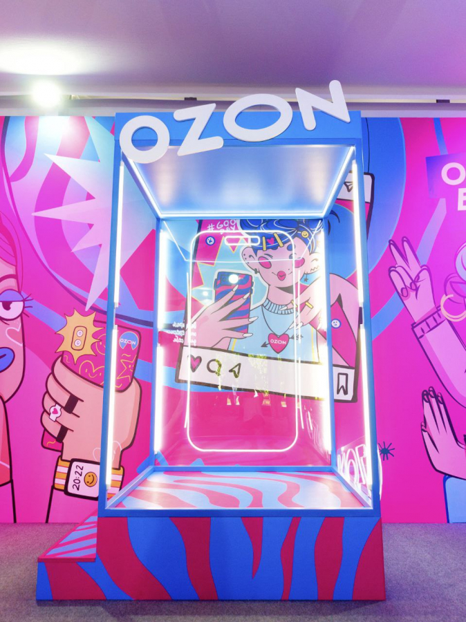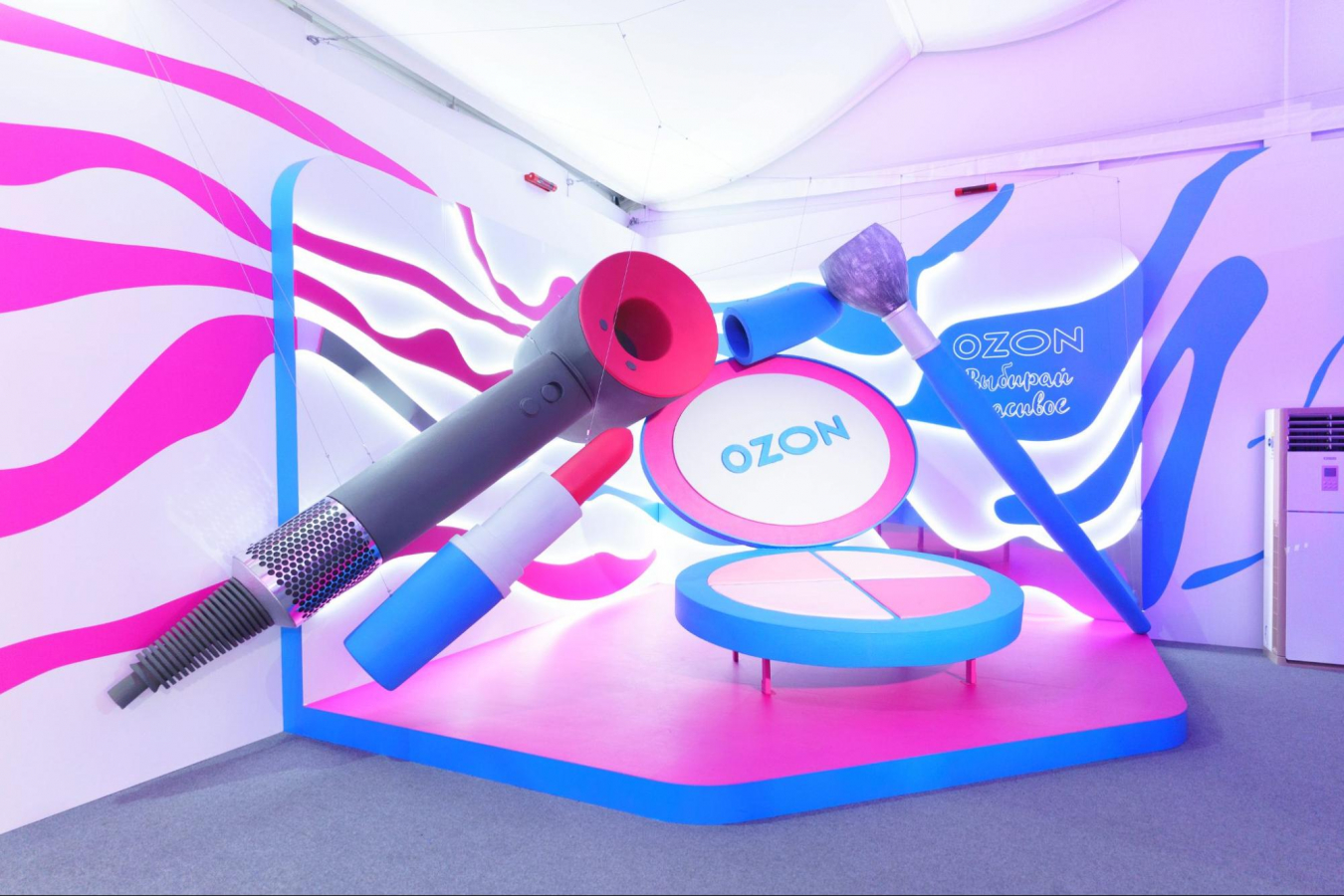 Пространство павильона было разделено на пять зон: Ozon для мам, для молодежи, бьюти-корнер, фотозона, сцена. Каждая зона раскрывала идею категорий Ozon: