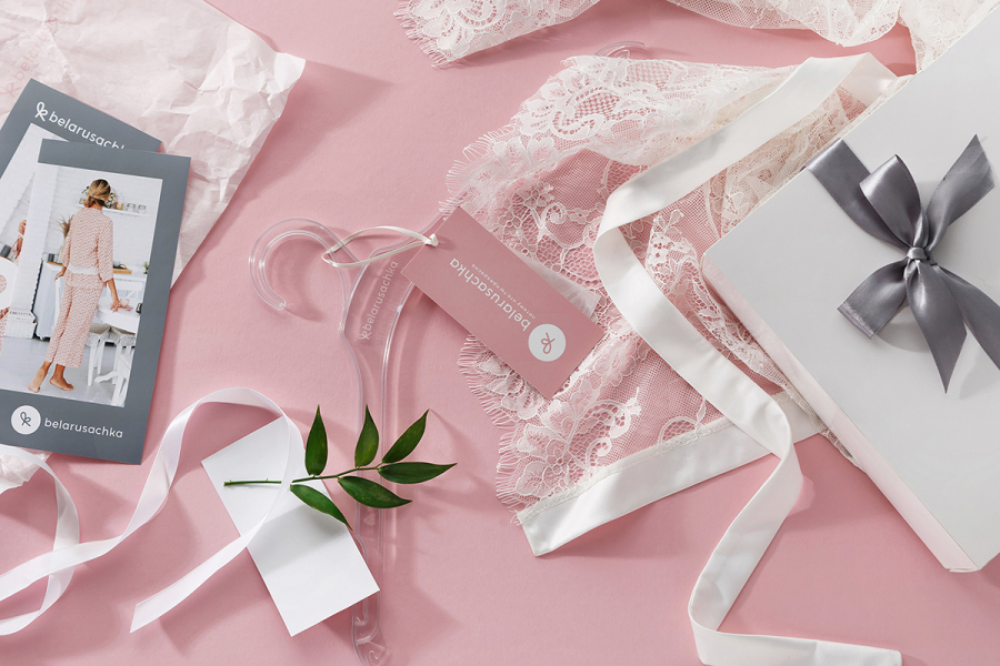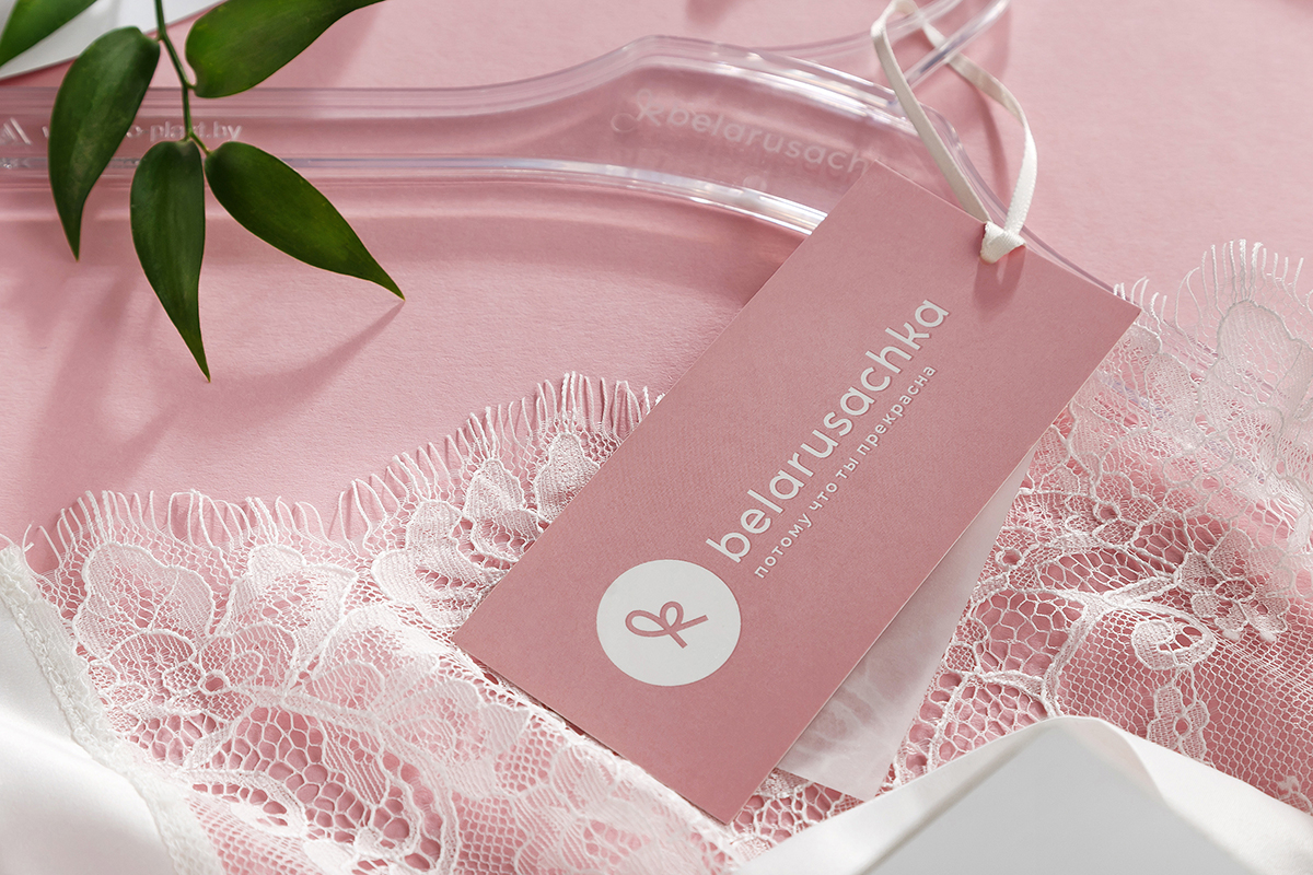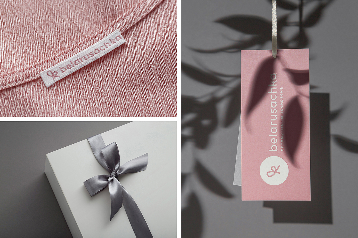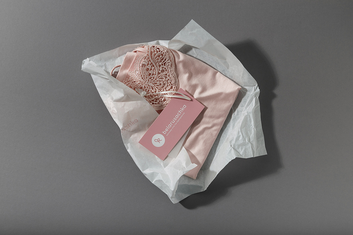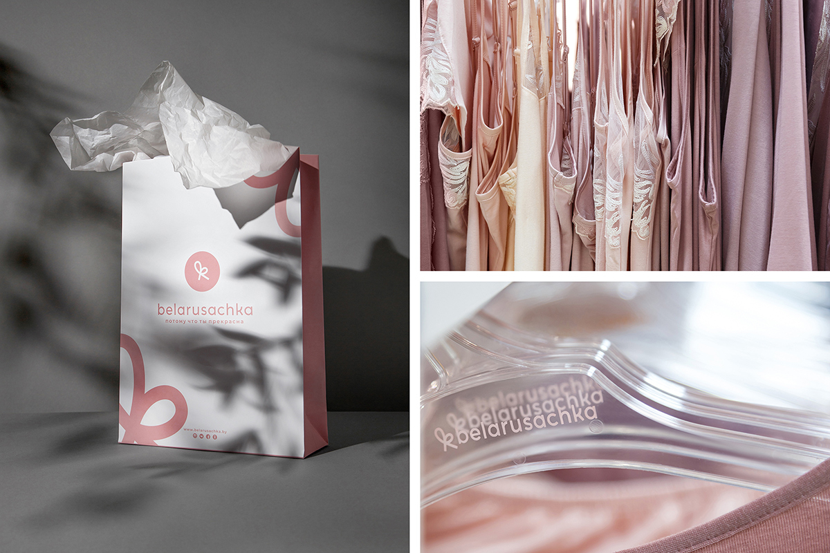 Для логотипа был выбран элегантный гротескный шрифт строчного регистра, который делает достаточно массивную конструкцию бренд-нейма простой для восприятия. Графический элемент — аллюзия на тонкое кружевное плетение — отсылает к деликатному подходу производителей к пошиву одежды. Универсальный фирменный стиль, построенный на сочетании пастельного розового и серого цветов, помогает легко забрендировать любые носители.