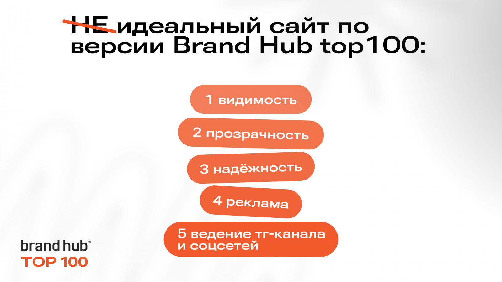 Когда первый этап проверки на эстетичность и информативность пройден, аналитики Brand Hub top100 приступают к следующей оценке — видимость и проявленность агентства на сторонних ресурсах: тг-каналы, соцсети, участие в конкурсах, награды, в каких ассоциациях состоят и сколько лет компания представлена на рынке.