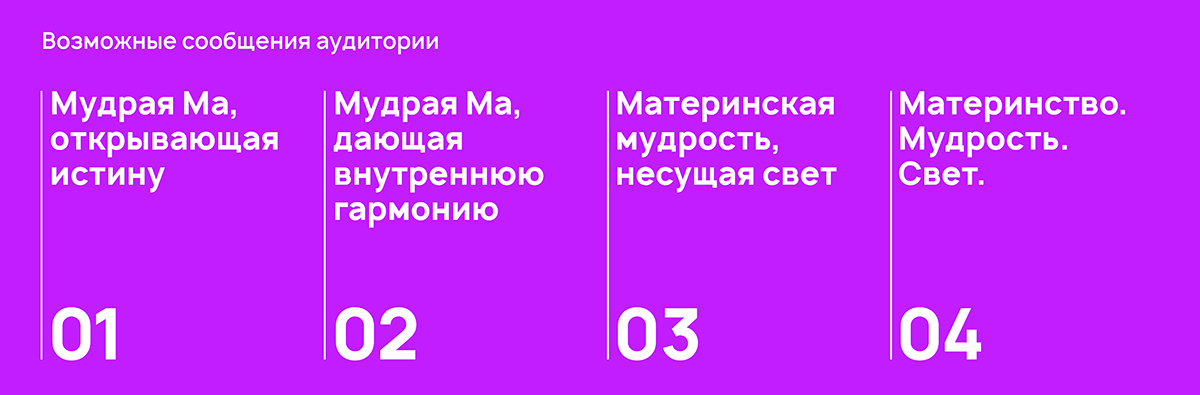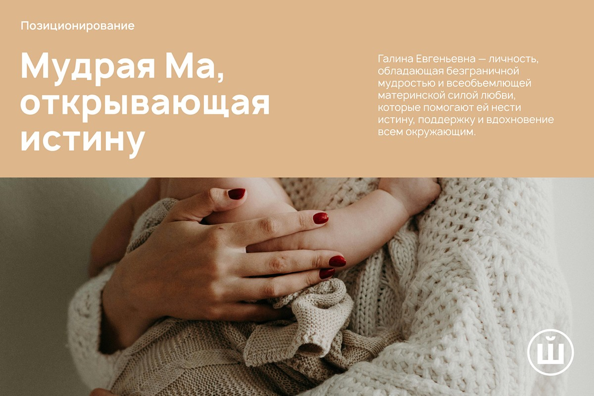 Агентство создало позиционирование «Мудрая Ма». Этот образ символизирует сочувствие, поддержку и способность задавать правильные вопросы. Логотип представляет собой букву «Ш», объединяющую элементы психологии и позитивных эмоций. В фирменном стиле используется «смайл», который вносит разнообразие в оформление диджитал-среды. Палитра личного бренда включает яркие оттенки лилового, синего и бежевого, которые подчеркивают эмоциональную окраску контента: бежевый — комфорт, синий — спокойствие и профессионализм, лиловый — чувственность и энергию.
