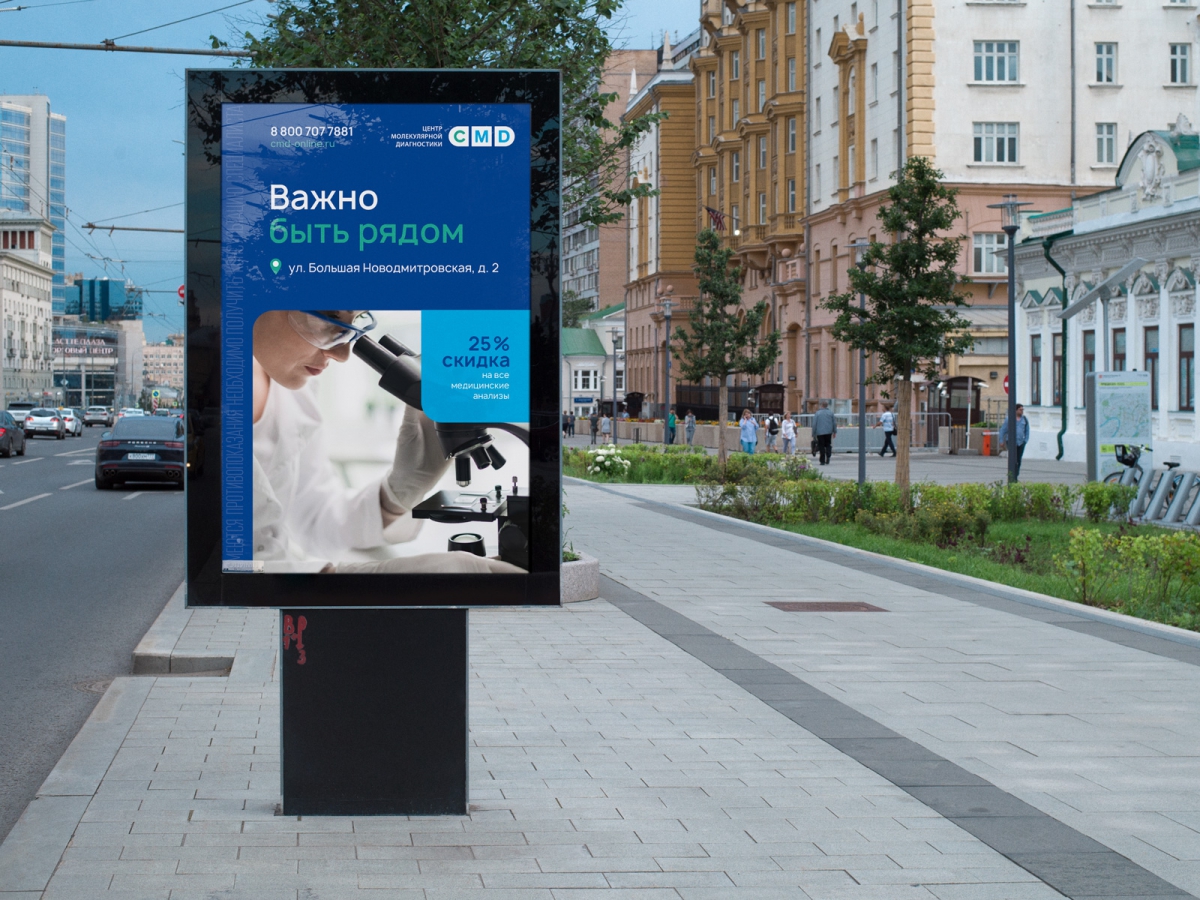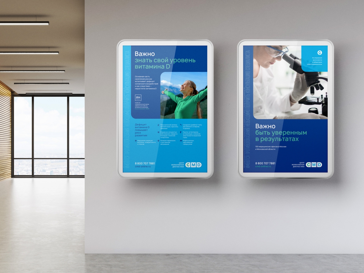 В вербальной части коммуникаций был сделан акцент на профессиональной ответственности лаборатории. CMD крайне внимательно относится к своей работе, потому что знает, насколько ВАЖНО здоровье людей. В типографике слово «важно» всегда дополнительно выделяется цветом.