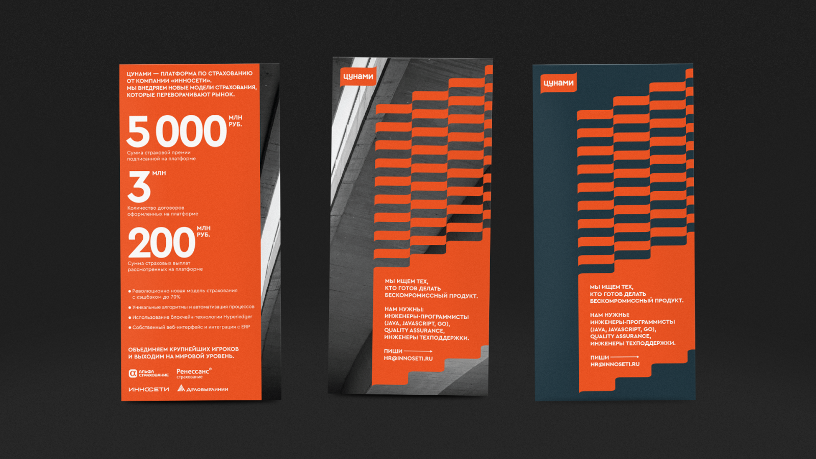 В основе системы визуальной идентификации три образа: флаг, волна, платформа. Слоган продукта «Делаем революцию на рынке страхования», флаг — один из ключевых образов революции. Название символизирует волну.
