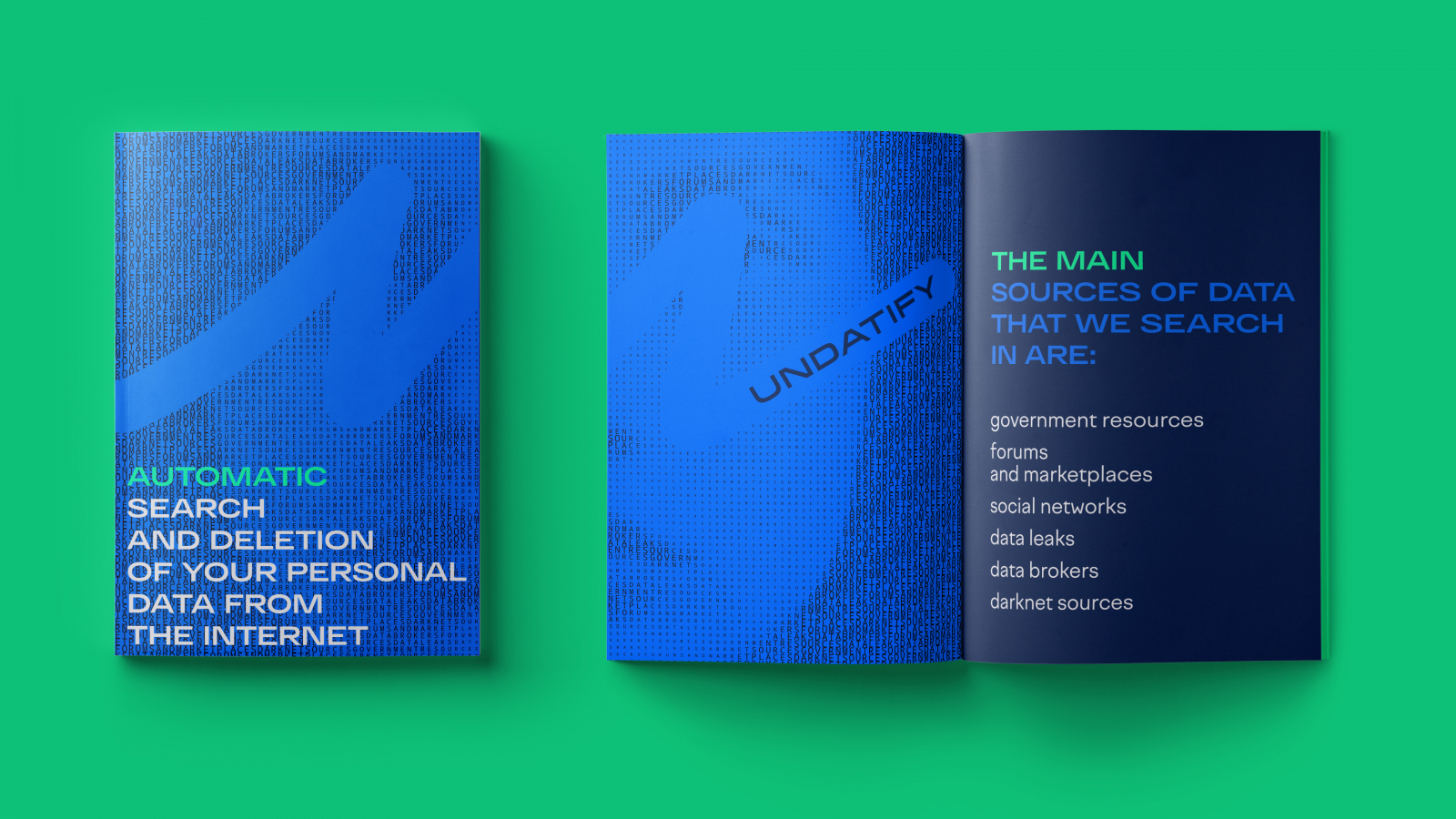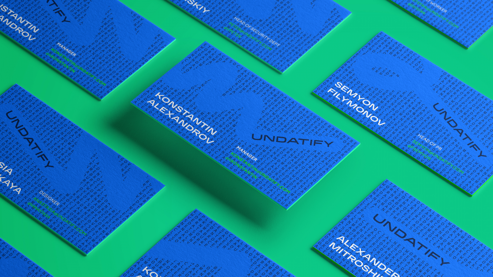 В качестве ключевого визуального образа креаторы выбрали буквенный код, символизирующий информацию. В нем зашифровали места, где чаще всего хранятся данные пользователей. Логотип Undatify поместили на плашку, стирающую личную информацию из цифрового пространства.