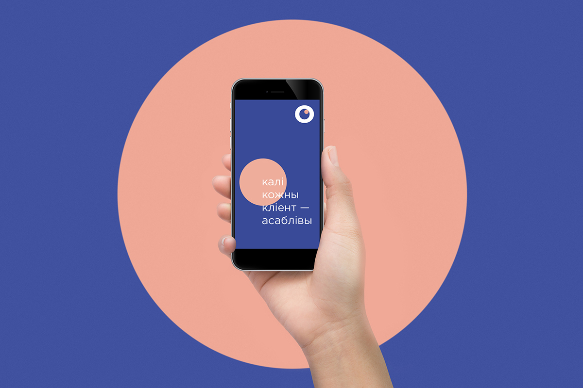 Слоган «Калі кожны кліент — асаблівы» транслирует философию бренда. Лаконичный визуальный образ построен на синем и персиковом цветах. Особенностью дизайн-решения стал круг, добавляющий индивидуальности шрифтовому логотипу.