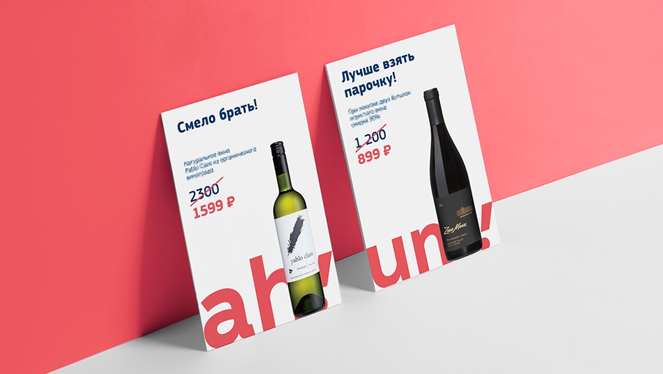 В своем решении студия Teamwork обратилась к теме эмоций, которые дарит отличное вино. W — это вино. А ещё: oh! какой вкус, wow! как выгодно и ah! как удобно.