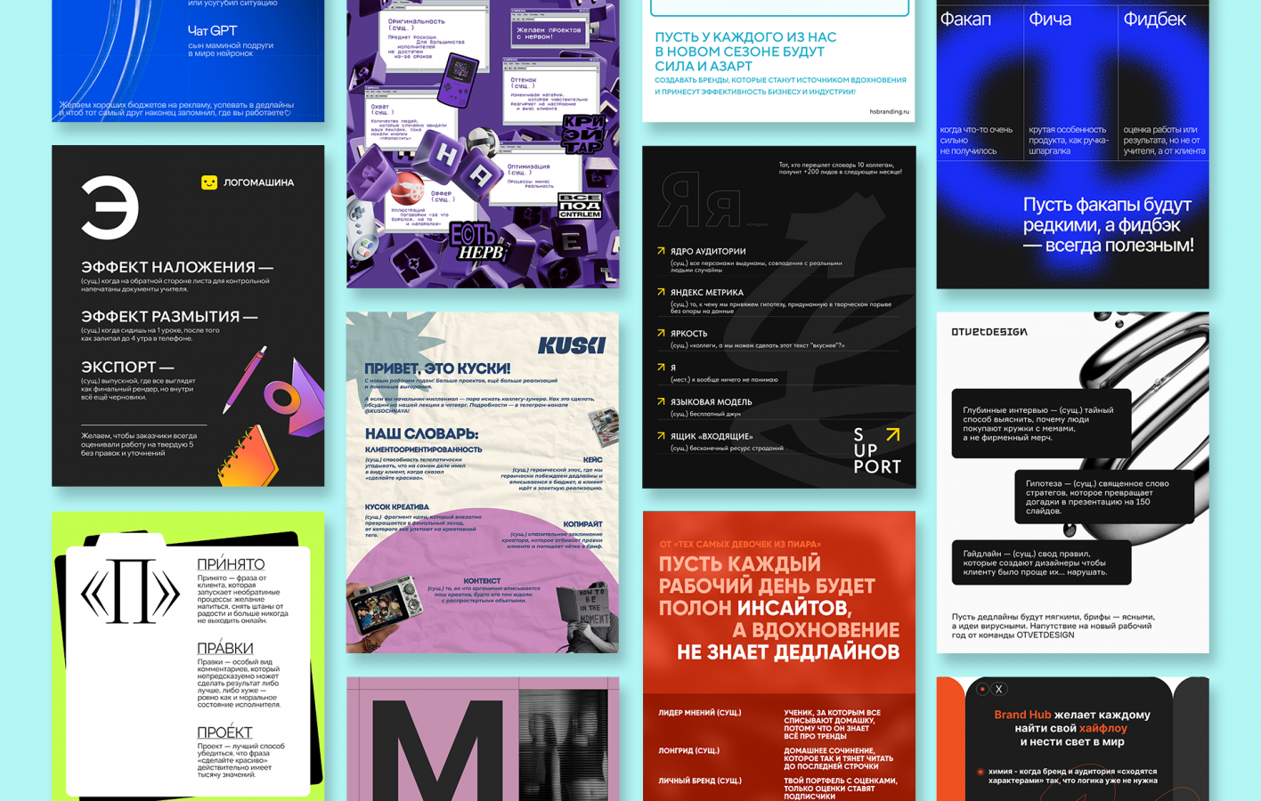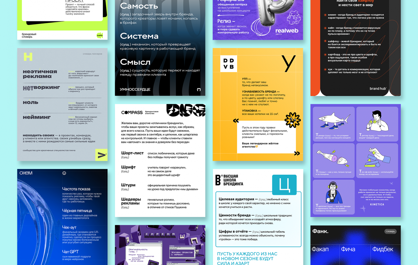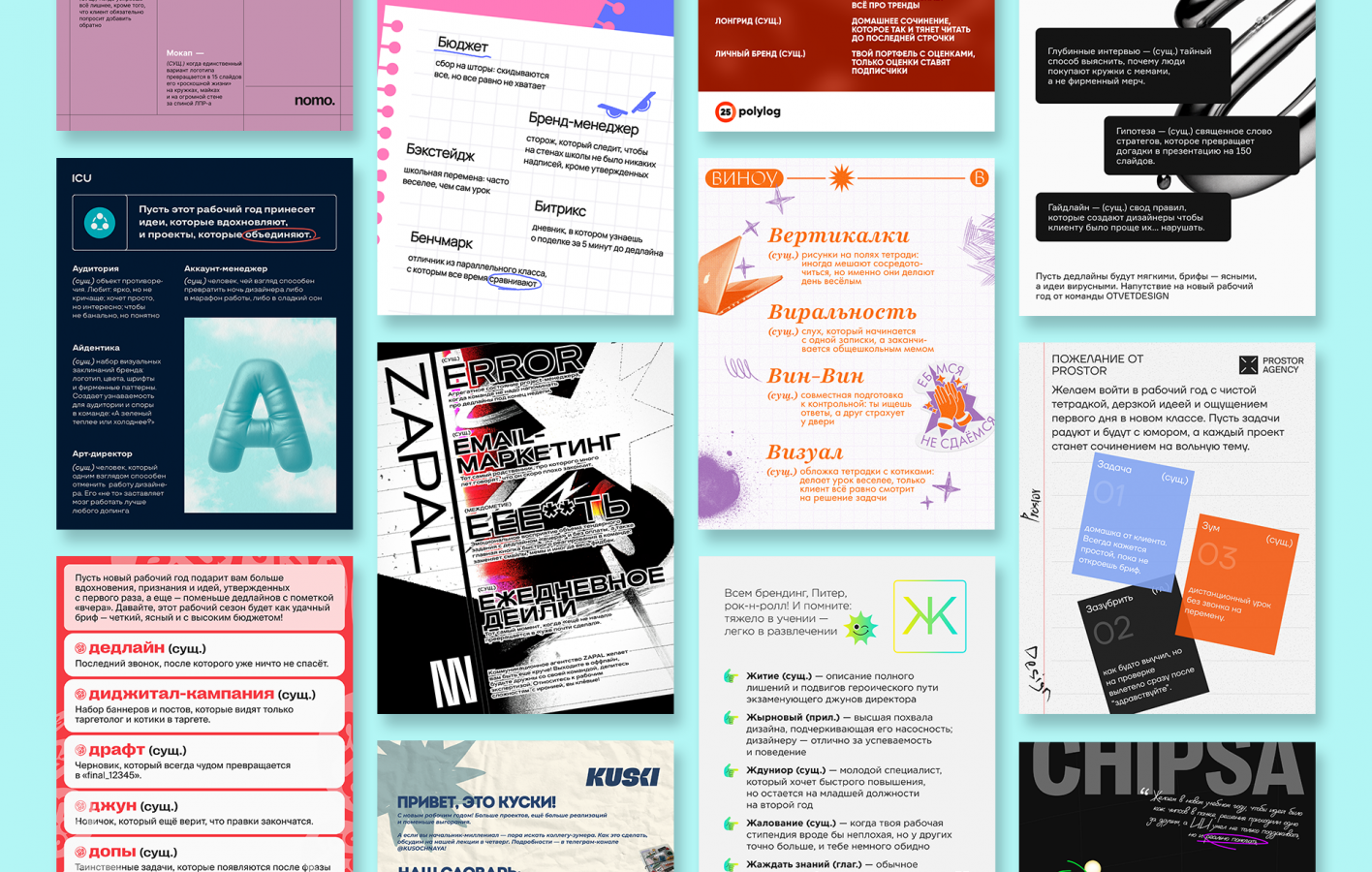 Каждое агентство хранит свои внутренние мемы и привычки речи. ICU предложило объединить эти голоса: формат школьного словаря превратился в коллективный проект, где каждая буква алфавита ассоциируется с отдельным агентством, а каждая шутка несет опыт целой команды.